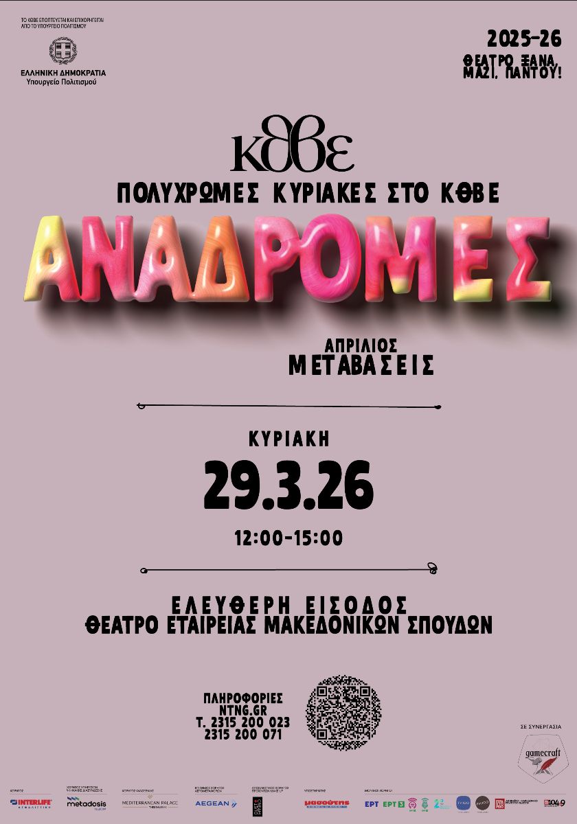 «Αναδρομές» είναι ο τίτλος της επόμενης Πολύχρωμης Κυριακής του ΚΘΒΕ που θα πραγματοποιηθεί την Κυριακή 29 Μαρτίου, στο Θέατρο της Εταιρείας Μακεδονικών Σπουδών.